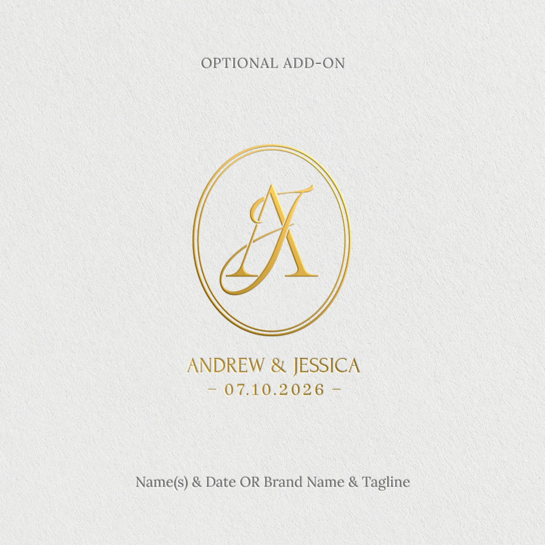 Your design assets include the monogram & framed monogram, monogram & framed monogram with name(s) and date (or tagline) – if selected – in high-resolution files for print (PDF), transparent background files for flexible use in images & video (PNG, SVG), files for social media and digital use (JPEG), and a vector design source file (AI) – perfect for professional printing, rescaling, or editing for any project.